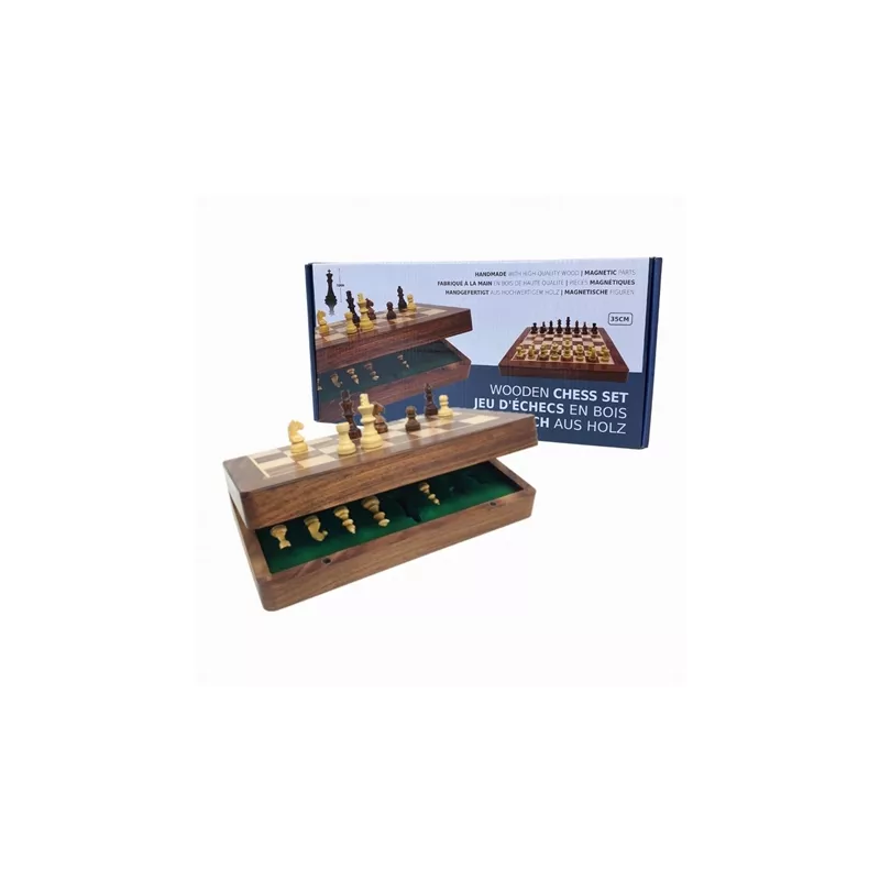 Jeu d'échecs de voyage de 35cm. Il est de bonne taille, 35 X 17,5 X 8 cm pour être transporté. Les pièces magnétiques lui donnent un confort appréciable pour jouer dans le train, en voiture ou sur un bateau. Le roi fait 76 mm de hauteur.