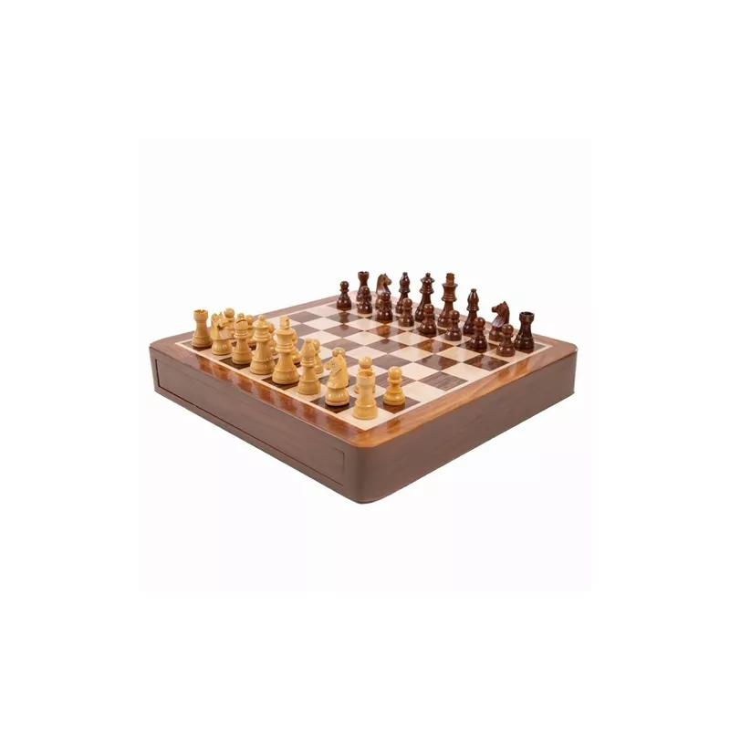 Jeu complet d'échecs carré de 25 x 25 cm. Les pièces magnétiques lui donnent un confort appréciable pour jouer dans un train, en voiture ou sur un bateau. Le tiroir permet de ranger les pièces parfaitement.