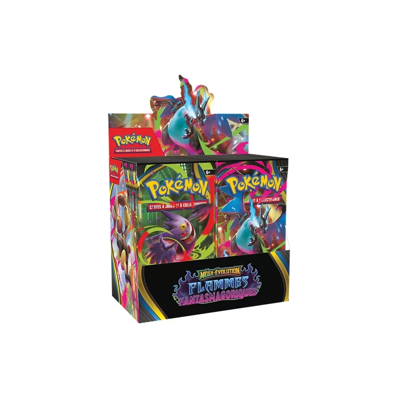Chaque booster de l'extension Méga-Évolution - Flammes Fantasmagoriques du JCC Pokémon contient 10 cartes, 1 énergie de base ou 1 carte à code pour le JCC Pokémon Live.