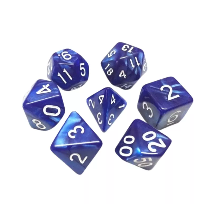 Lot de 7 dés bleu nuit nacrés, gravés, avec des chiffres en blanc.
