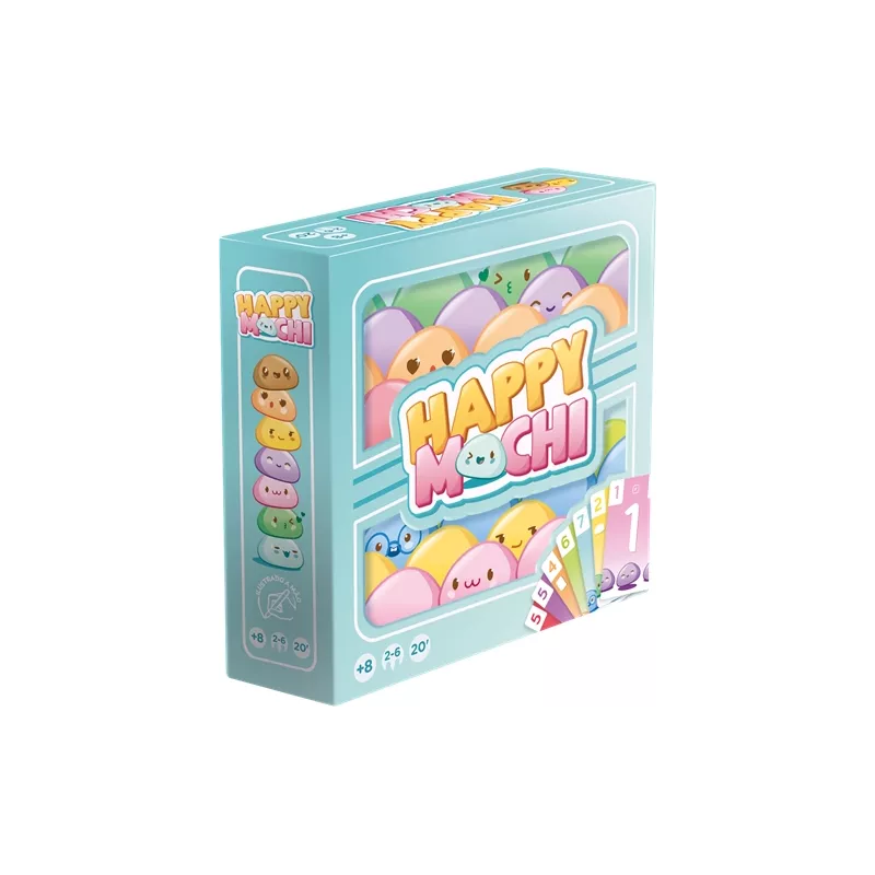Dans Happy Mochi, vous recevez 7 cartes que vous ne pouvez pas classer ! À votre tour, piochez une carte ou jouez un duo. Pour ce faire, prenez deux cartes ADJACENTES dans votre main pour recouvrir le duo central, en respectant les contraintes de valeur (inférieure ou supérieure) et de couleur. Si vous jouez deux cartes de même valeur, c’est un Happy Mochi, ne tenez pas compte des contraintes ! Une fois un duo joué, appliquez ses effets éventuels : tourner la carte Sens, faire piocher, passer une carte à son voisin, ou mettre une carte en réserve.