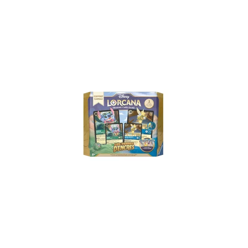 Le coffret cadeau contient deux cartes brillantes grand format à collectionner et deux cartes de jeu brillantes, en plus de jetons de jeu et de quatre boosters. Le coffret cadeau pour Disney Lorcana : Les Terres d'Encres comprend Stitch - Agent sous couverture et La Fée Clochette - Fée très maline.