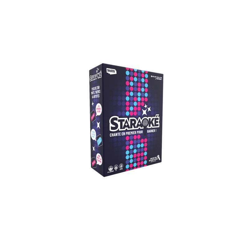 Staraoké est un jeu musical de rapidité où les joueurs doivent chanter un extrait de chanson contenant le mot, le thème ou artistes indiqués sur la carte catégorie. Le premier qui attrape le micro et chante un extrait correspondant à la carte catégorie remporte le tour. Des cartes spéciales STAR TOUR contiennent également un mot ou artistes mais déclenchent une « mort subite ». A tour de rôle les joueurs doivent chanter une chanson respectant la catégorie de la carte. Le dernier en lice remporte le tour.