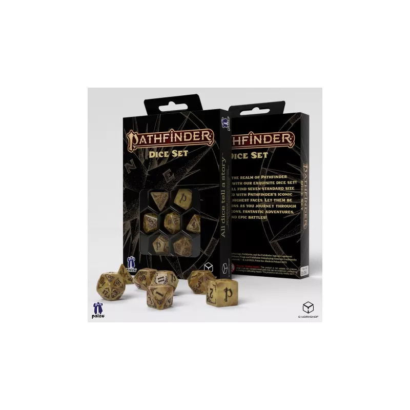 Q WORKSHOP et Paizo sont fiers de présenter un jeu de dés officiel de 7 pièces, simple et élégant comme le jeu remasterisé Pathfinder Second Edition. Pas lié par une campagne spécifique, ils peuvent s’adapter à n’importe quel jeu que vous voulez! Le fond des dés est doré comme les trésors du continent perdu d’Azlant, et les chiffres lisibles sont peints en noir comme les profondeurs dans lesquelles ils sont. Le logo Pathfinder orne les visages les plus élevés.