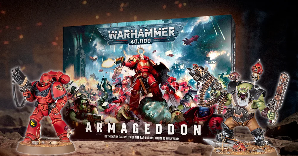 Le coffret de lancement s'appelle Warhammer 40,000 : Armageddon et oppose les Blood Angels aux Orks — un retour aux sources pour les vétérans, puisque la Troisième Guerre d'Armageddon est l'un des conflits les plus emblématiques du lore 40K.