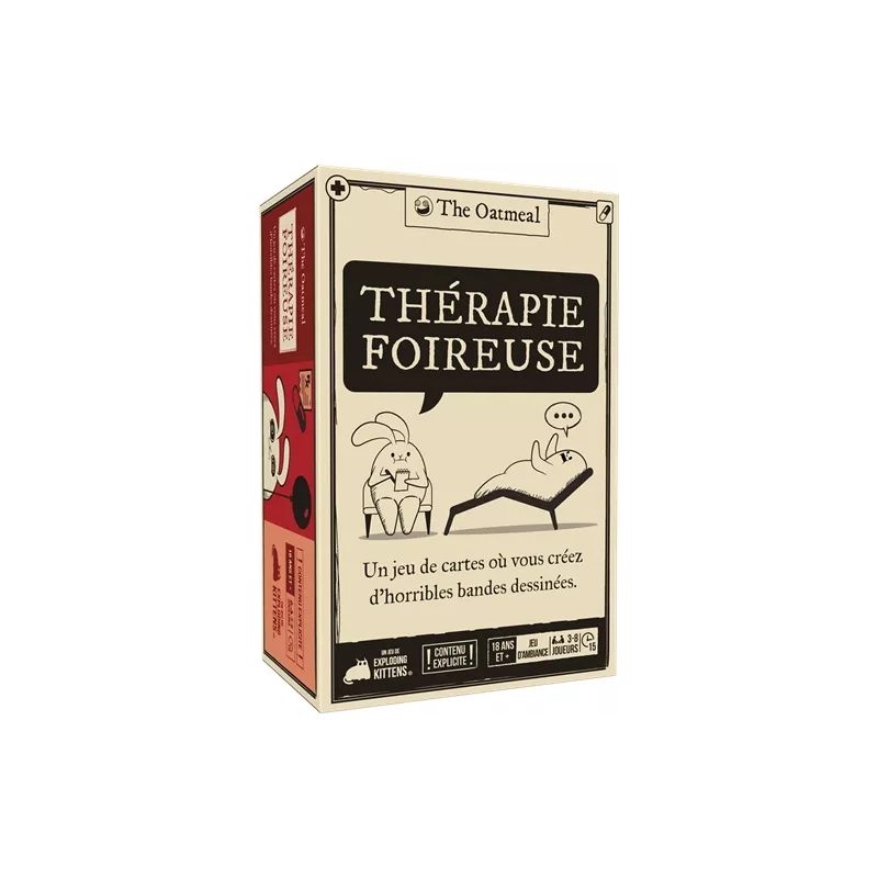 Conçu par The Oatmeal (le célèbre auteur de BD) et les créateurs d’Exploding Kittens, Thérapie Foireuse est un jeu à l’humour noir délibérément trash, réservé aux adultes. Avec plus de 400 cartes, chaque partie est unique. Âmes sensibles s'abstenir ! Les autres s'amuseront...comme des petits fous !
