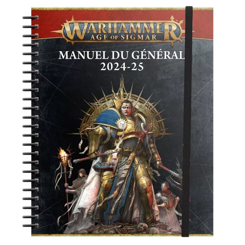 Le Manuel du Général Warhammer Age of Sigmar 2024-25 mesure 161mmx210mm et est doté d'un fermoir élastique pratique qui permet de le maintenir en place dans la tourmente de la bataille.