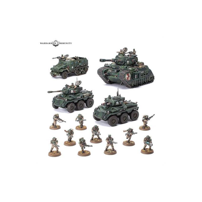 Imposez votre supériorité blindée avec une force mécanisée parfaite pour combattre sur les sables irradiés d’Armageddon. Le Bataillon: Astra Militarum est la première boîte qui vous permettra de mettre la main sur les nouveaux VBC Hippogriff et VFR Centaur. Chaque Hippogriff peut être armé d’un canon Vigilator, d’un canon gatling Chiron, d’un canon à fusion ou d’un canon laser lourd pour affronter une grande variété de cibles. La boîte inclut aussi un puissant Char de Combat Rogal Dorn et 10 Troupes de Choc Cadiennes pour les embarquer à l’arrière du Centaur.